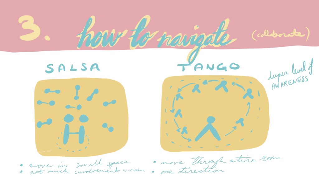 Here are my first sketches. Been pondering on how I can highlight some of the “tango-wonders” that we all can learn from and apply in life. It’s not my meaning to put salsa as a less meaningful dance, all dancing is great. But I needed a social dance to compare with tango in in order to highlight what makes the art of tango special and why we can all learn from it to have more sustainable collaborations.